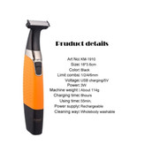 استفاده از ماشین اصلاحی که بتواند موهای بدن را زیر دوش یا با استفاده از فوم کوتاه کند، برای بسیاری از مردان مهم است. KM-1910 که توسط شرکت «کیمی» (Kemei) مدل ارجینال تولید شده، دارای قابلیت شستشو و مقاومت در برابر آب است که موجب کوتاه کردن راحتتر موهای بدن میشود. این محصول سریهای قابل شستشو نیز دارد که در صورت استفاده از فوم و خمیر ریش میتوان آنها را شست. تیغههای از جنس استیل ضدزنگ این دستگاه ،به مقاومت دستگاه در برابر رطوبت و زنگزدگی میافزاید. برای KM-1910 باتری قابل شارژ بهعنوان منبع تغذیه در نظر گرفته شده است. این محصول 3 شانه در اندازههای مختلف دارد که موجب کوتاه شدن موهای بدن در 4 اندازه ی مختلف میشود. همچنین با استفاده از سری تریمر این دستگاه میتوان موهای بدن را در اندازهی 0.2 میلیمتر کوتاه کرد و از داشتن تهریشی زیبا لذت برد . از اقلام همراه این مدل میتوان به روغن اشاره کرد که موجب راحتتر حرکت کردن تیغههای ماشین اصلاح میشود. با استفاده از برس تمیز کننده میتوان موهای باقی مانده در دستگاه را تمیز کرد.از نکات جالبی که میتوان در استفاده کردن از این دستگاه اشاره کرد، طراحی مناسب بدنه است که در دست گرفتن و قرار دادن آن را روی پوست صورت آسانتر میکند. KM-1910 دارای تیغه از جنس استیل ضد زنگ، قابلیت شستشو، سری قابل شستشو، منبع تغذیهی باتری قابل شارژ است.