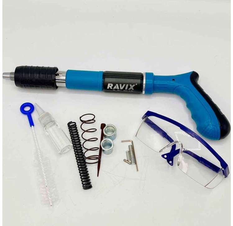 میخکوب RAVIX اصلی اورجینال امکان استفاده در بتن، پلاستیک، ورق های نازک فلزی، چوب و ... را دارد .میخکوب RAVIX قابلیت استفاده میخ تا 5 سانتیمتر را دارد. میخکوب RAVIX کارکرد ساده و قوی دارد.میخکوب RAVIX اصلی بدون نیاز به چاشنی انفجاری جداگانه می باشد. میخکوب بسیار سبک، کم حجم وقابل حمل می باشد . میخکوب RAVIX محصولی جدید و با تکنولوژی به روز جهت جایگزینی برای میخکوب های والتی، کامرکس و ... می باشد. میخکوب RAVIX بدون نیاز به چاشنی انفجاری می باشد.میخکوب RAVIX دارای کیف حمل، عینک، فرچه، فنر یدک می باشد تفنک میخکوب ابزاری است مشابه تفنگ بادی است. تفنگ میخکوب بتن برای اتصال پلیت ها و صفحات مختلف به بتن می باشد. البته مصارف دیگری از جمله اتصال انواع توری های مشبک و غیره به صفحه های بتنی و مصالح ساختمانی را نیز دارد. این تفنگ ها به وسیله چاشنی میخ موجود در خان تفنگ را با شدت به سمت هدف شلیک کرده و واشری که بر روی میخ قرار دارد صفحه را بر روی بتن نگه می دارد. با قرار دادن چاشنی مخصوص در داخل دستگاه و قرار دادن میخ در محل تعیینشده، میتوانید از این ابزار استفاده کنید. چاشنیهایی که برای این محصول در نظر گرفتهاند در دو نوع و برای کوبیدن میخ در فلز یا بتن هستند. نوع میخی که برای این دستگاه مورد استفاده قرار میگیرد، از گونههای واشردار است. از این دستگاه در شغلهای مختلف که با چوب و فلز سروکار دارند، استفاده میکنند.