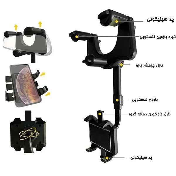 کیفیت درجه یک وارداتی ، جنس ABS , چرخش 360 درجه ، گیره مخصوص تنظیم ارتفاع ، نصب بر روی آینه خودرو 🚗