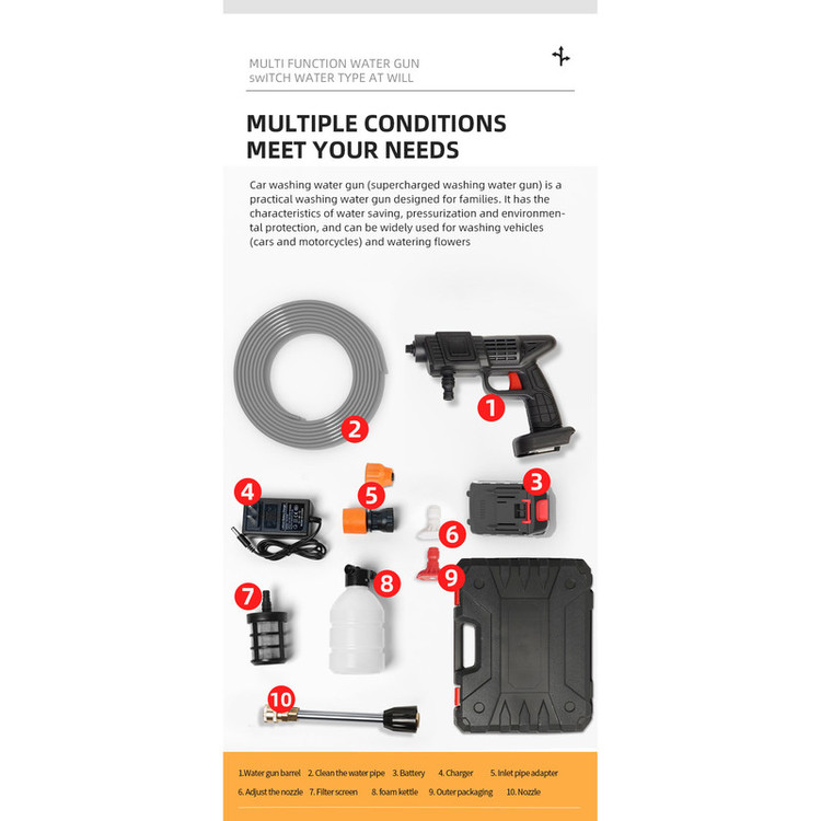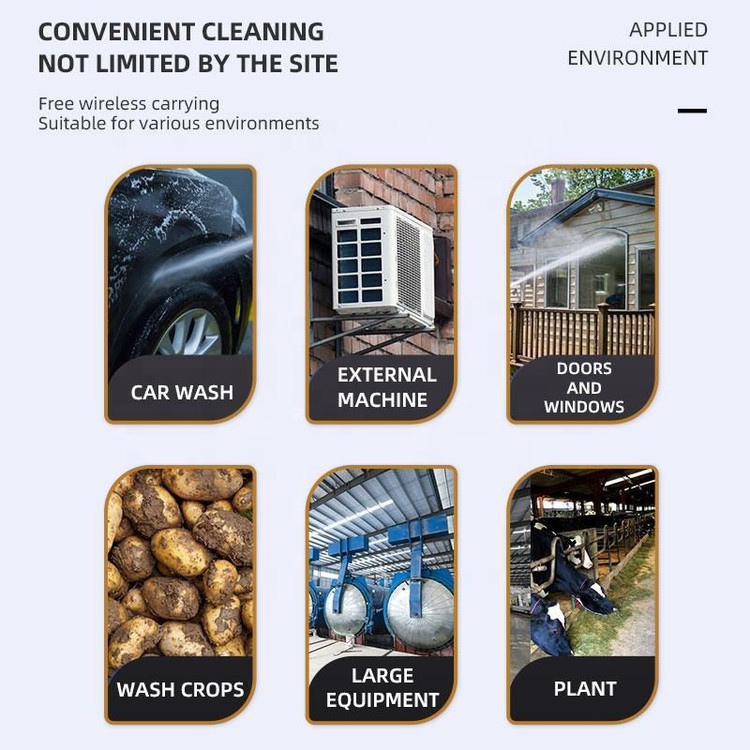 کارواش سیار شارژی با دو باتری علاوه بر قدرت، سبک و ارگونومیک طراحی شده است تا کاربر بتواند آن را به راحتی حمل و استفاده طولانی مدت کند. کنترل فشار قابل تنظیم به شما اجازه میدهد تا میزان فشار آب را متناسب با نوع سطح تنظیم کنید؛ از شستشوی ملایم بدنه خودرو تا تمیزکاری قوی تجهیزات صنعتی و سنگی.